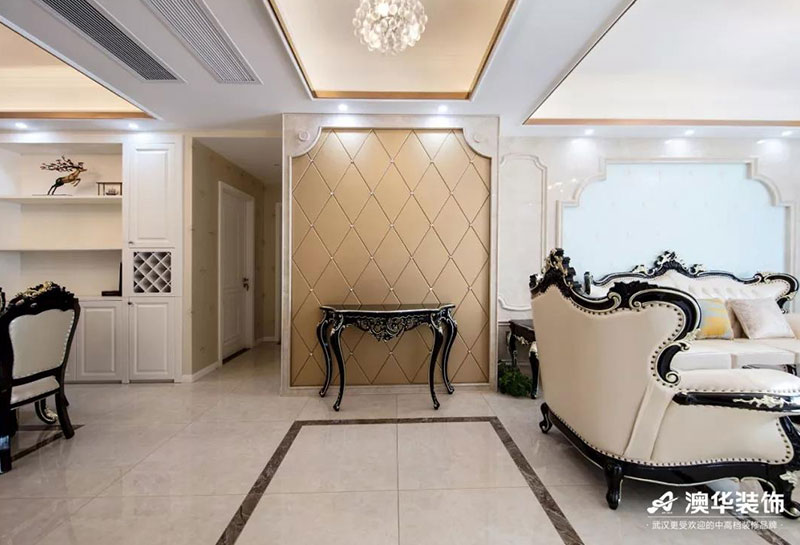 ? 歐式風格的客廳,背景墻材料上以石材為主,結合墻板,用墻布進行點綴,看起來非常典雅。頂面運用金屬線條的設計,配上精心挑選的歐式造型家具,讓整體感覺既奢華又低調,還帶有一點小小的浪漫。獨特的隱形門設計,讓整體效果更完美。