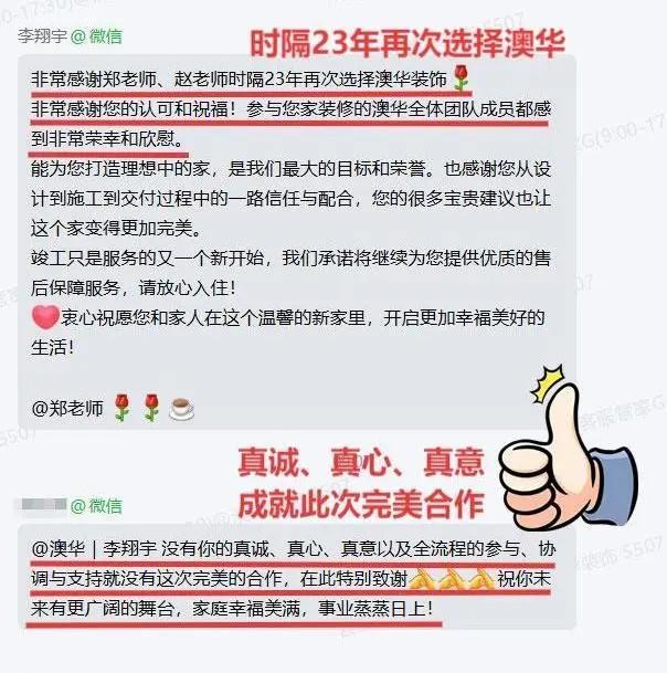 又到了更新好評的日子——有客戶時隔23年再次選擇澳華,有客戶表示澳華是她“半生以來最滿意的一次裝修”,有客戶回憶和分享了他在澳華裝修的體會和感動,有的客戶點名表揚了裝修過程中的每一位工作人員......