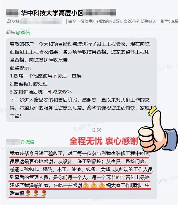 我家裝修今日竣工驗收了,對于每一位參與到我家裝修工程中的人員表達最衷心地感謝,從設計、施工到品控;從家具、系統(tǒng)門窗,暖通...到水電、瓷磚、木工、油漆、線條、美縫...從前端的工作人員到幕后的管理人員,是你們每一個人、每一個環(huán)節(jié)的辛苦付出最終建成了我溫暖的家,在此一并感謝祝大家工作順利、生活幸福!