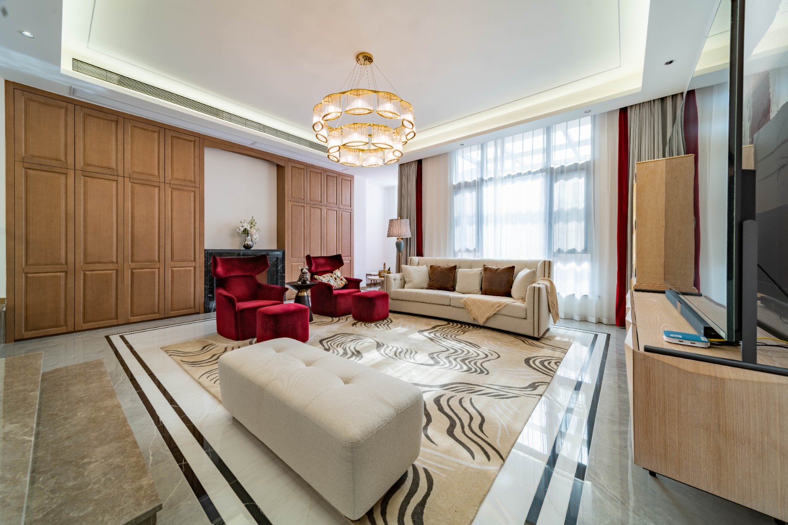 從庭院之中,步入客廳,可見一派古典與現代交融之美。淺原木為主色調,白色為輔,點綴上明媚華麗的紅絲絨,營造出質感與溫度并存的空間。