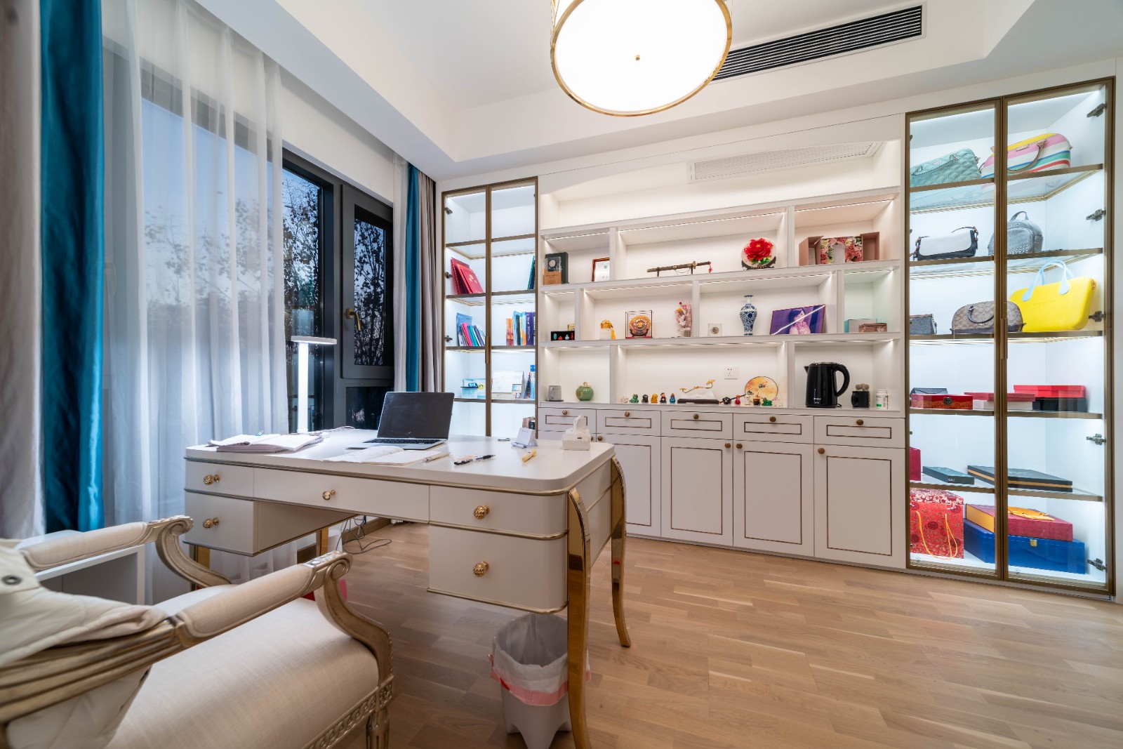 走進女主人的衣帽間,奶油色與金邊鑲嵌的入墻展示柜,將優雅與精致的氣質拿捏了。氛圍燈光在柜內渲染出柔和的光線,增加了層次感。U型衣帽間,收納充足而有序。這里還承載了女主人辦公的功能,工作之余,就能眺望窗外的美景。