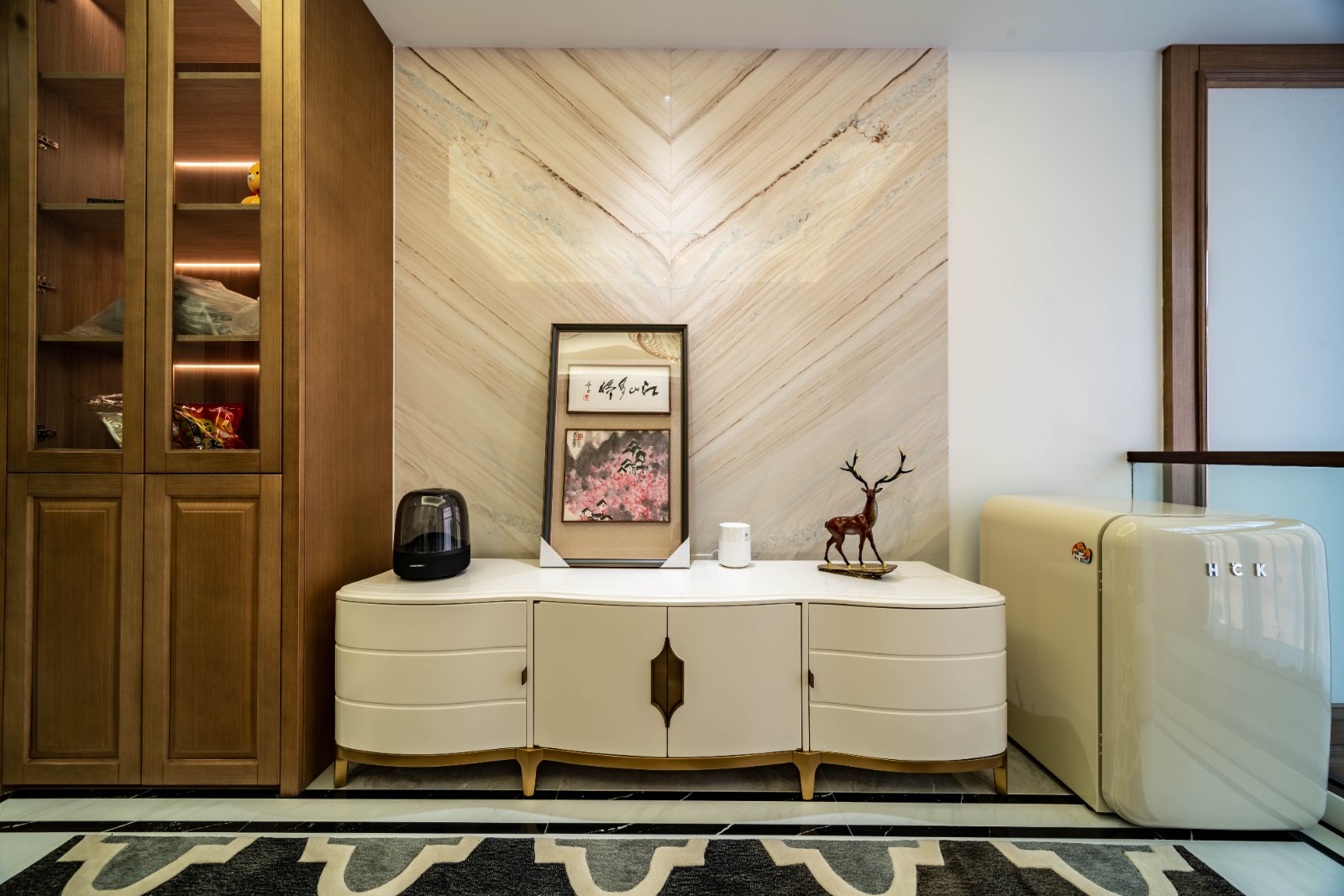 步入男主人的書房,太師椅、中式書桌、書架,大量中式傳統元素的木作設計,輕盈簡雅又富文化內涵。男主人在這里潑墨揮毫、遒勁篆刻,在城市中心遁離喧囂,拾獲純粹的靜謐。