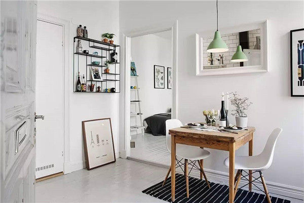 想營造出浪漫的就餐氛圍,周邊的裝飾不能少。一盞小吊燈,就能為給用餐環境加分。墻上還可以安置置物架,放置一些餐具,利用垂直空間,給用餐區增容。