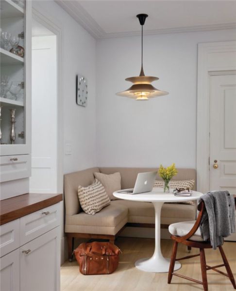 ▲如果用餐區采光較差,餐桌的顏色盡量要以淺色系為宜。轉角椅比較特殊,需要根據尺寸定制。