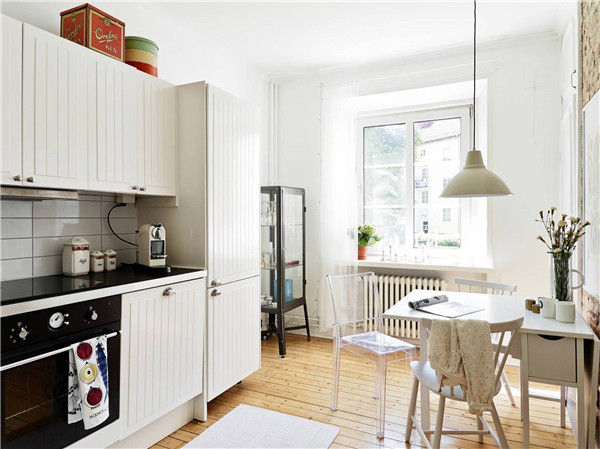 很多老房都是廚房跨陽臺的設(shè)計,廚房面積比較大,雖然是長條形,安放一張小餐桌也并不是什么難題。