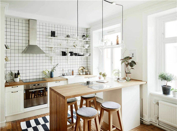 如果廚房本身空間比較寬敞,不妨在設(shè)計櫥柜的時候預(yù)留出小吧臺,做飯、用餐都可以在這里進(jìn)行。
