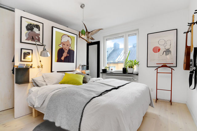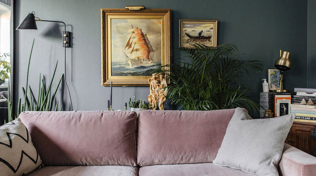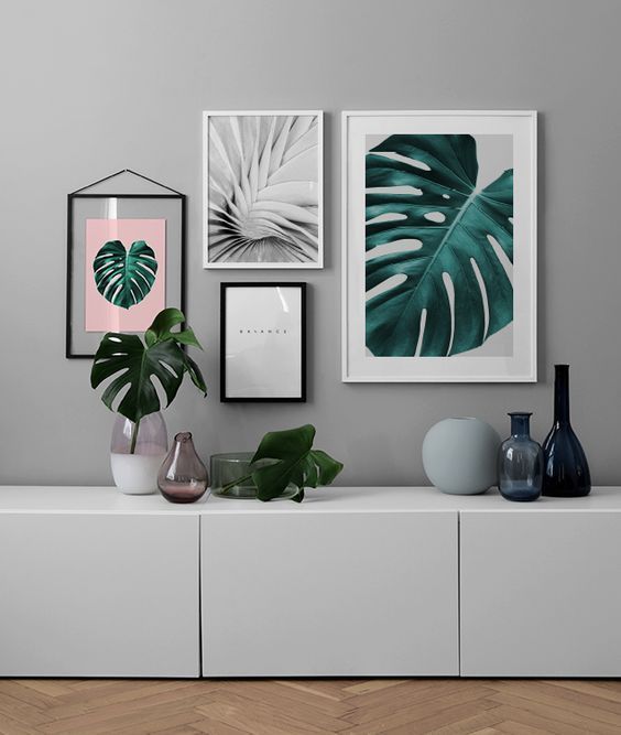 比如房間是暖色調(diào),那么畫就選擇冷色系的,冷色調(diào)的房間就選擇暖色系的框畫。像下圖深灰色的墻面容易顯得暗沉,粉色在這幾幅框畫中更容易吸引我們的眼球。