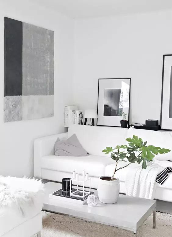 如果不想懸掛,可以選擇沙發(fā)后面做上一塊擱置板,然后將裝飾畫擺放在擱置板上做裝飾。
