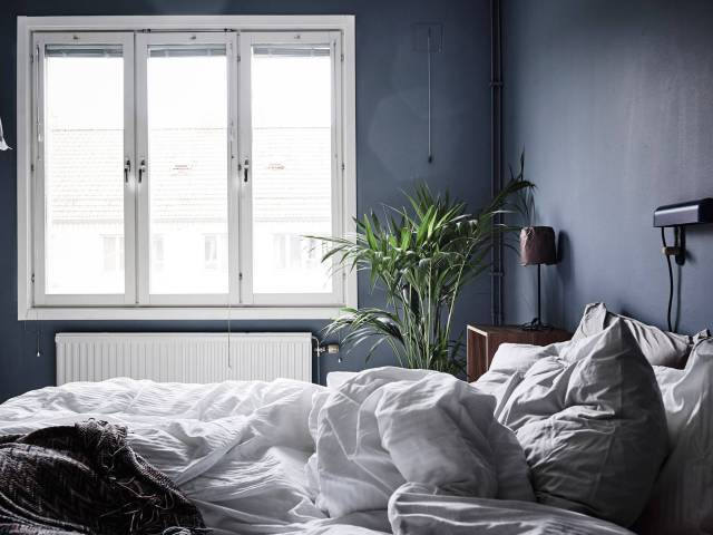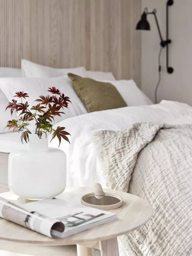 ▲ 這間臥室采用大面積原木做基底,黑色線條勾勒,棉麻材質(zhì)填充,植物點(diǎn)綴,用色冷靜而克制,大地色系和豐富的天然材質(zhì)營造出自然樸素的氛圍。