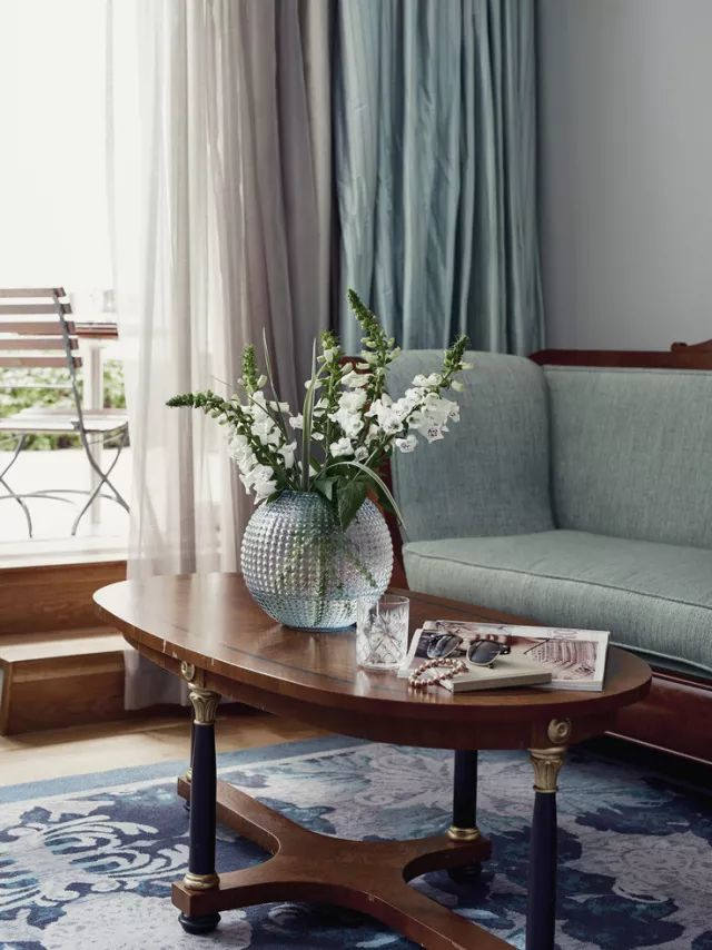 ▲ 這間則讓人第一眼感受到滿滿的典雅和復(fù)古氣息,因?yàn)槭褂昧祟伾练€(wěn)的胡桃木家具,天鵝絨窗簾的復(fù)古綠、羊毛地毯的孔雀藍(lán)也極具年代感……這些都是顏色和材質(zhì)在起作用。