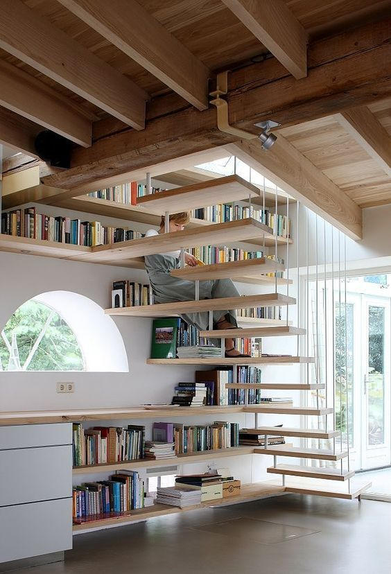 沿著樓梯設(shè)計(jì)書(shū)架是很多書(shū)店會(huì)用到的創(chuàng)意,現(xiàn)在你可以把這個(gè)創(chuàng)意搬到自己家,想看書(shū)的時(shí)候隨時(shí)坐下來(lái),是不是超方便~