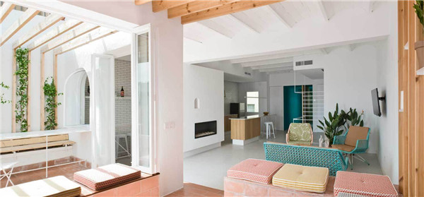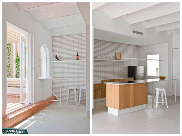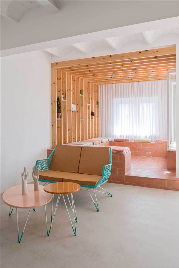 ▲在客廳隔出專屬休閑區域, 用鮮艷的紅磚與質樸的原木包裹它,形成鮮明的特色。由墻面延伸至屋頂的木條格裝飾,形成一個90°的轉角,銜接自然。加上小擱板,讓它成為你的個人展示臺,你可以盡情將這里打造成你的綠植樂園。