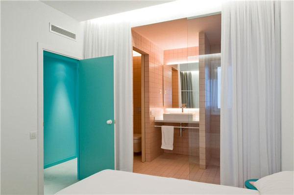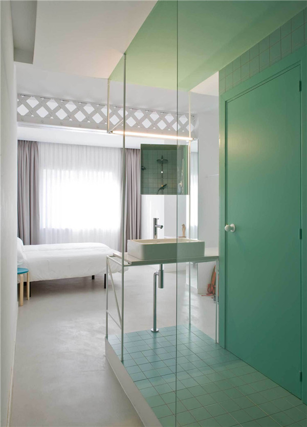 ▲進入臥室的走廊。鮮艷的色彩與外面的空間有了明顯的區分,藍色與綠色的搭配,讓靜謐與寧靜達到平衡,豐富了室內色彩的層次感。
