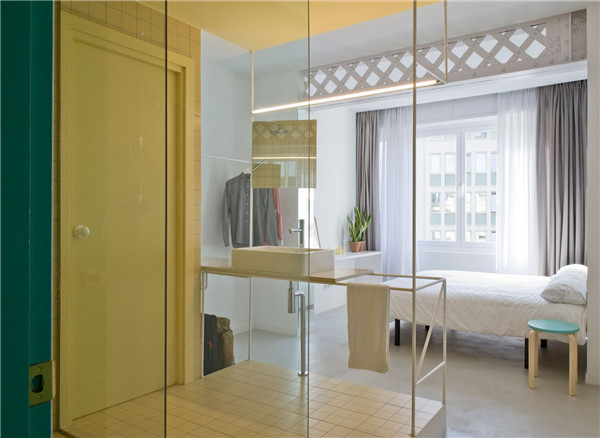 ▲不同于前一個臥室,此臥室以明媚的金黃色來填充衛生間的墻面及門框,將洗漱區移出,采用玻璃門的設計,顯得通透、澄澈,同時,經過玻璃面對光線的反射,空間面積在無形中被放大,絲毫不顯局促。