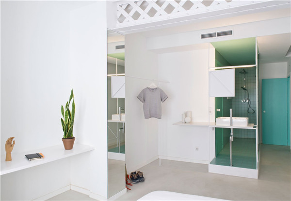 ▲房間整體以純潔的白色調為主,用海水藍及磚紅色局部裝飾,避免白色過于寡淡。依托狹長型布局,因勢利導,實現衛生間干濕分離。