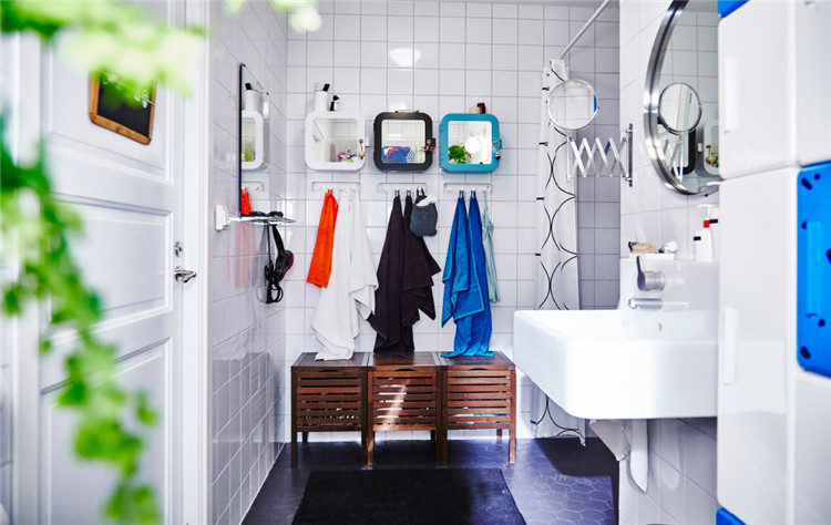 海水藍的空間,帶來清新涼爽的感覺,最適合武漢這大熱天了!利用掛桿將毛巾、浴巾、衣物等分類擺放,剩下地方放一個小浴缸,頂級奢華配置,小空間學習的典范!