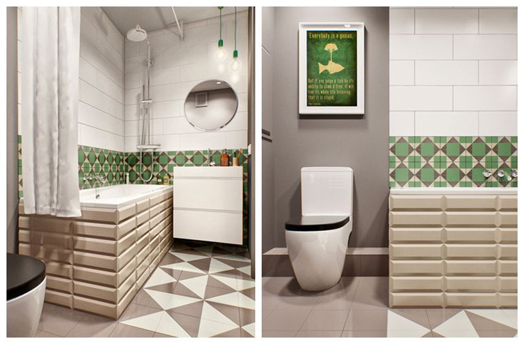 不想衛生間太單調?適當給它來點顏色吧~綠色的拼接花紋墻磚看起來很不錯,搭配同色系的宣傳畫,整體色調更協調。