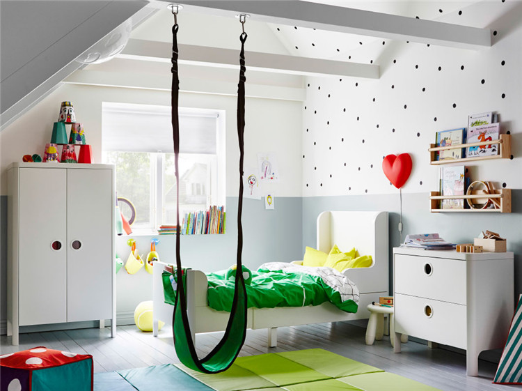 帶床頭板和抵板的床會讓孩子覺得更有安全感。這個時候,他們已經(jīng)具有自己的想法了,不妨就按照他們的喜好來吧~想要一個秋千?可以。我們只需要將其固定好,并在地上鋪上厚厚的墊子,做好安全措施,至于剩下的,就讓他們自由去發(fā)揮吧~
