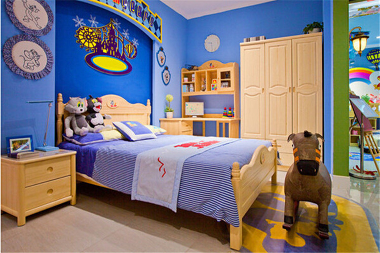 以藍(lán)色為主色調(diào)的空間,能夠最大程度激發(fā)孩子的創(chuàng)造力,讓他們的小腦瓜更睿智。房間整體裝飾采用迪士尼的貓和老鼠系列,無論是床頭擺放的布偶還是墻上擺放的裝飾畫,都在呼應(yīng)這一主題,還原出孩子心中的的童話世界。
