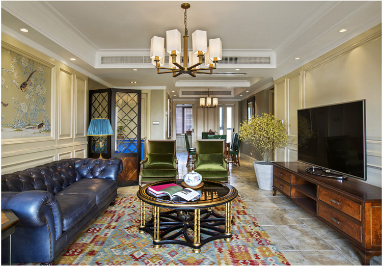 與陳俊生家一樣,這種美式的復古風一不小心就能讓空間顯得壓抑。設計師大膽用整面墻的金色渲染氛圍,與金屬茶幾暗暗呼應。低明度的藍綠雙色沙發為客廳增添亮點,巧妙用一方民族風地毯實現視覺上的過渡,讓一切水到渠成。