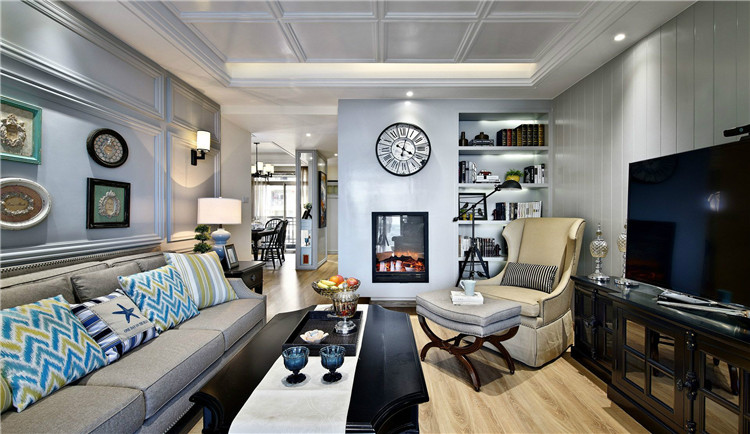 通過吊頂及墻面的獨特造型保留美式經典的歷史感,摒棄了其中繁瑣的裝潢,讓客廳在保證簡潔明快的同時顯得較清爽自然。客廳一角設置一個簡易讀書角落,由此劃分為兩個功能區,互不打擾,更方便家人們的相互陪伴,家有小戶型的朋友該好好學習了!