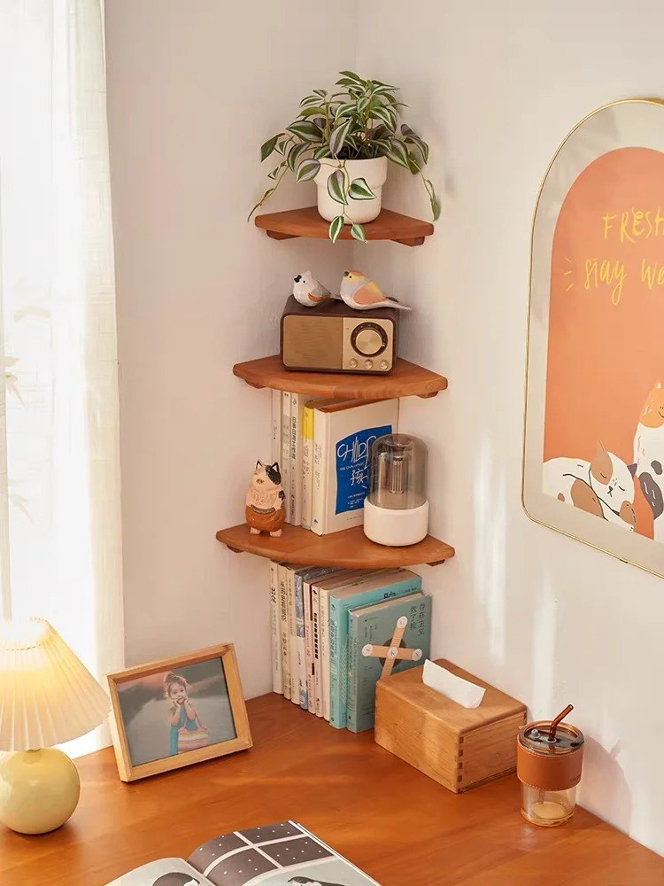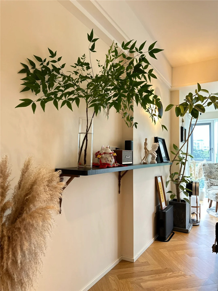 比起轉(zhuǎn)角柜,擱板安裝更方便。如后續(xù)需要調(diào)整,也能輕易拆解。開放式的擱板配上一些小飾物,也可以為空間增添設(shè)計感。