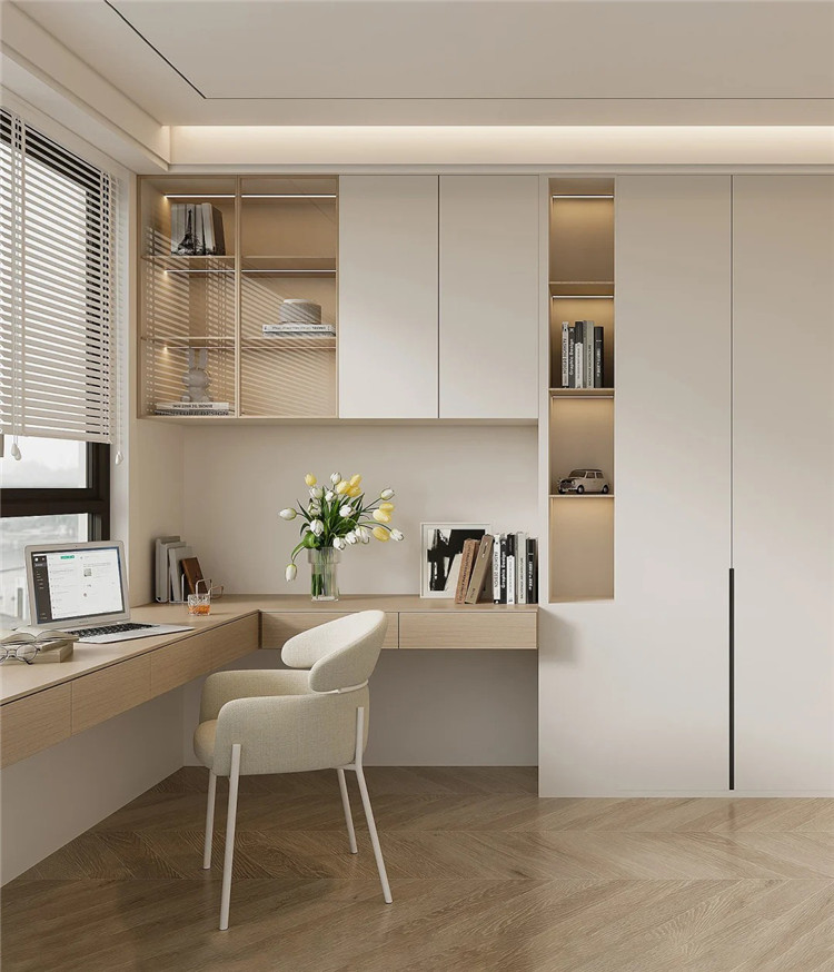 如果收納需求比較高的話,可于書桌上方做吊柜,或?qū)腋楞暯訒瘛?/p>