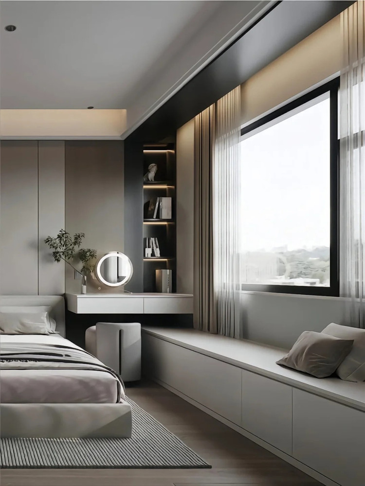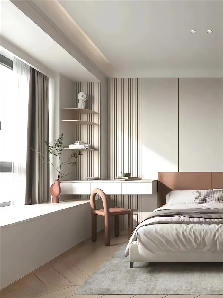位于飄窗旁的轉(zhuǎn)角,可定制開放式收納格,增加儲物量的同時,也不壓縮空間,兼顧了顏值與實(shí)用性。