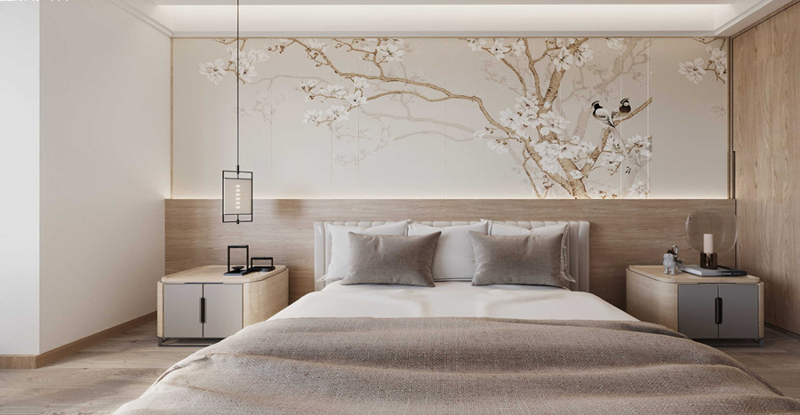 臥室區域使用了簡單的淡色系色彩裝飾空間,灰色的沙發、床頭背景墻搭配上藕粉色的窗簾,強調一種柔和溫馨感;黑色的臺燈搭配上藝術感十足的掛畫,則為空間增添了一抹現代時尚氣息。