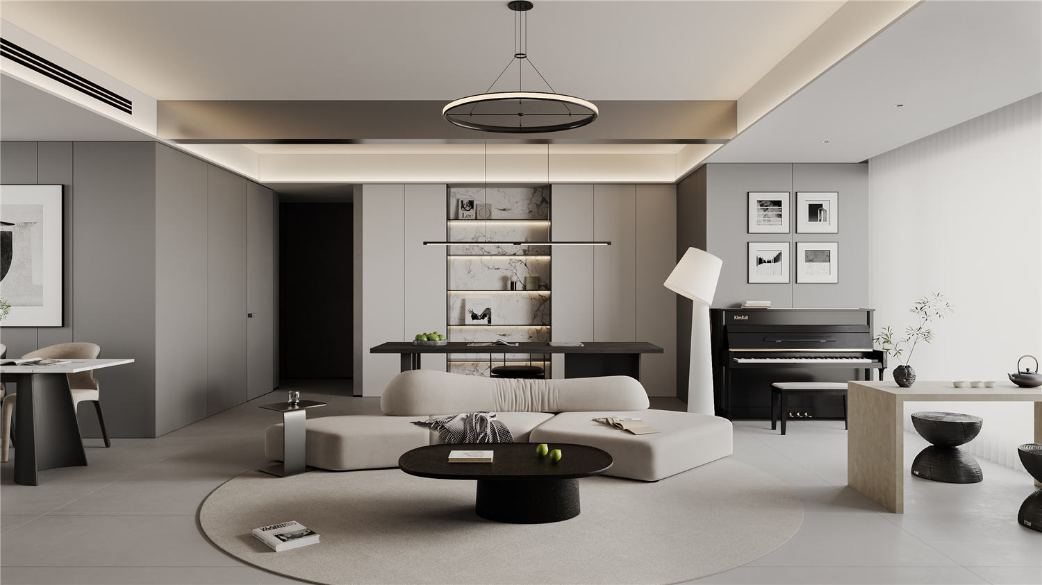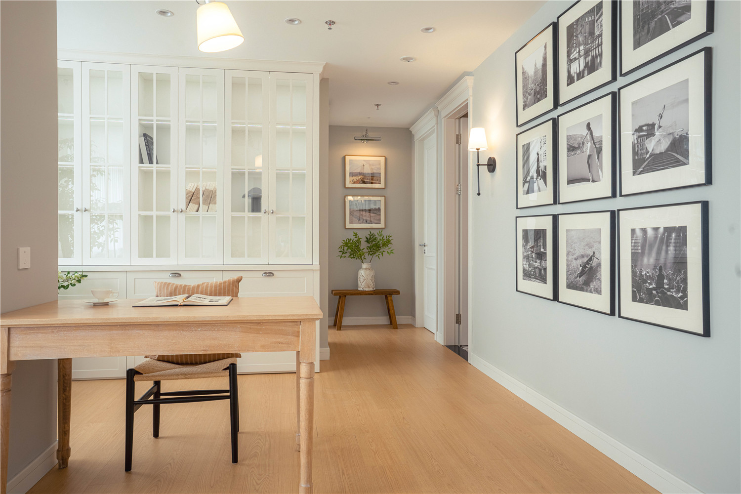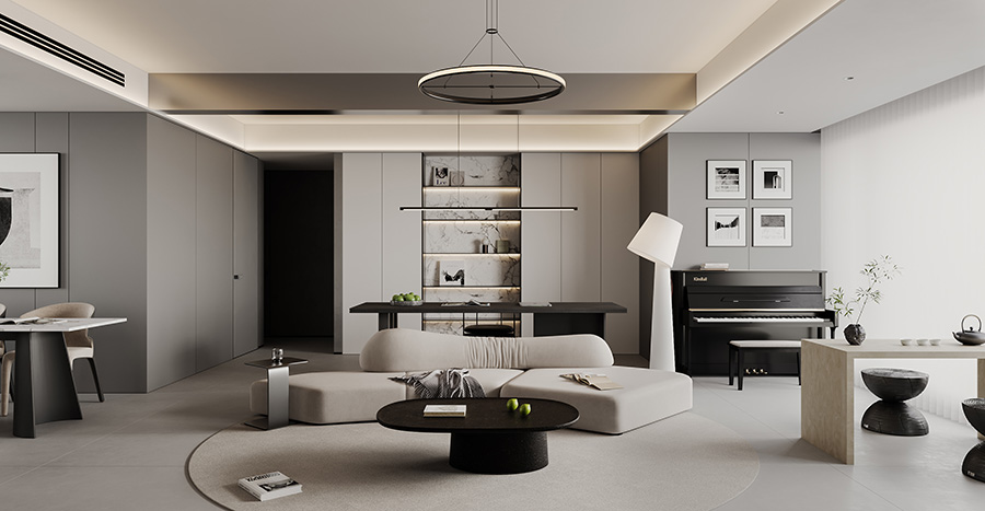 客廳區域的走廊處利用凹陷吊頂設計搭配暖黃色的圓形燈具營造一種簡約而又不失典雅的華貴美,走廊鏡頭則使用深黃色暗紋的墻紙進行裝飾,搭配以清新油畫,讓空間區域更顯明快清新。