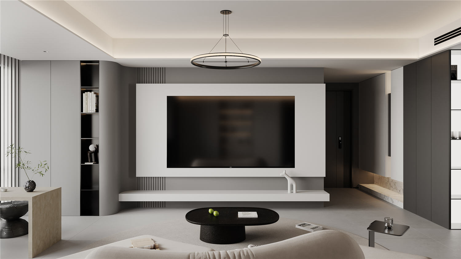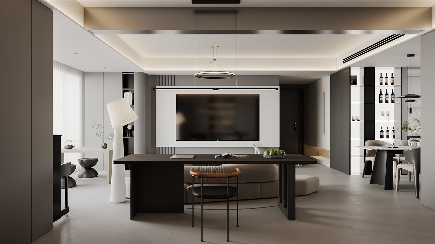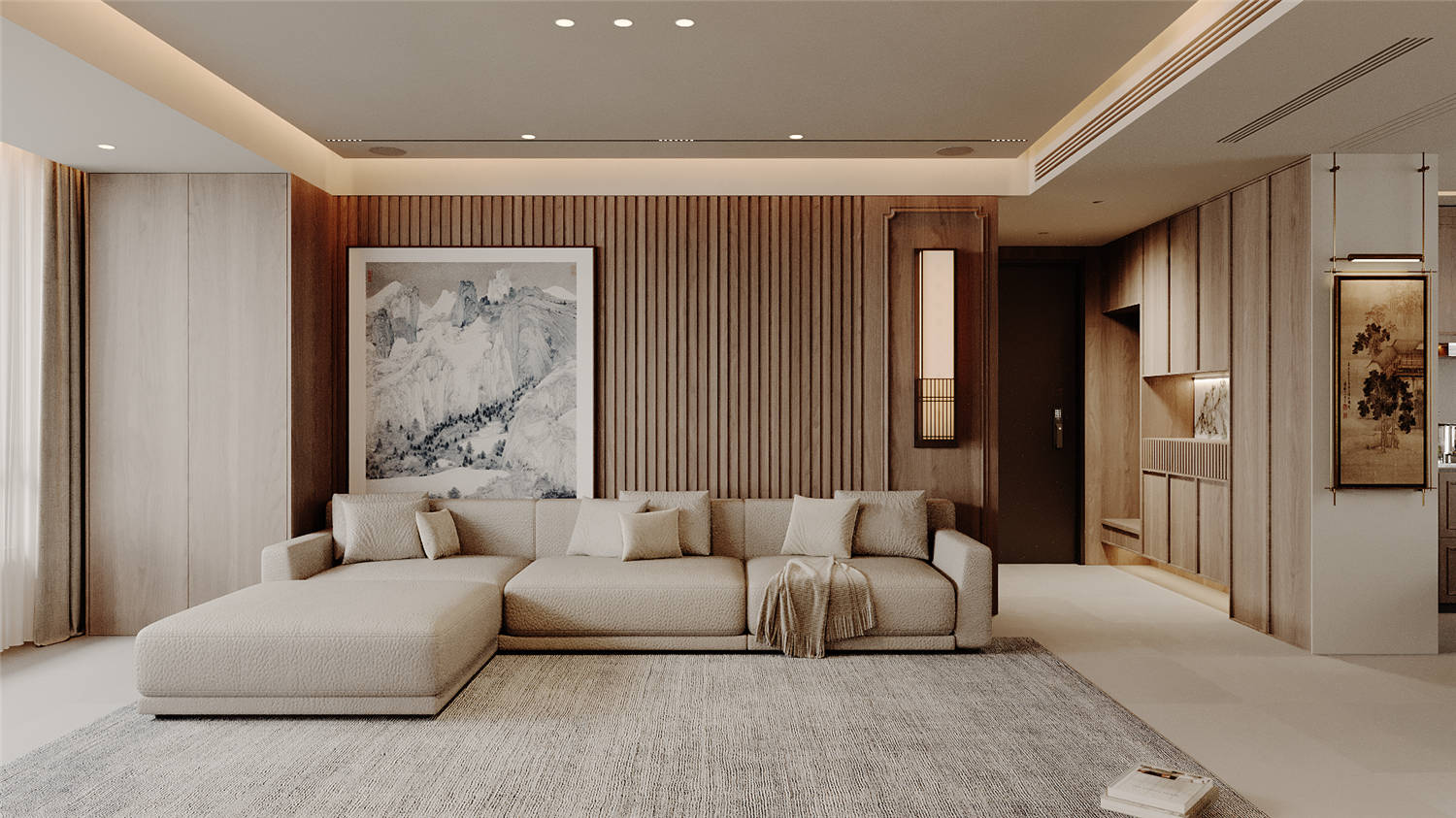 客廳區域的走廊處利用凹陷吊頂設計搭配暖黃色的圓形燈具營造一種簡約而又不失典雅的華貴美,走廊鏡頭則使用深黃色暗紋的墻紙進行裝飾,搭配以清新油畫,讓空間區域更顯明快清新。