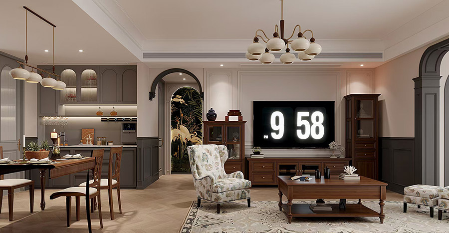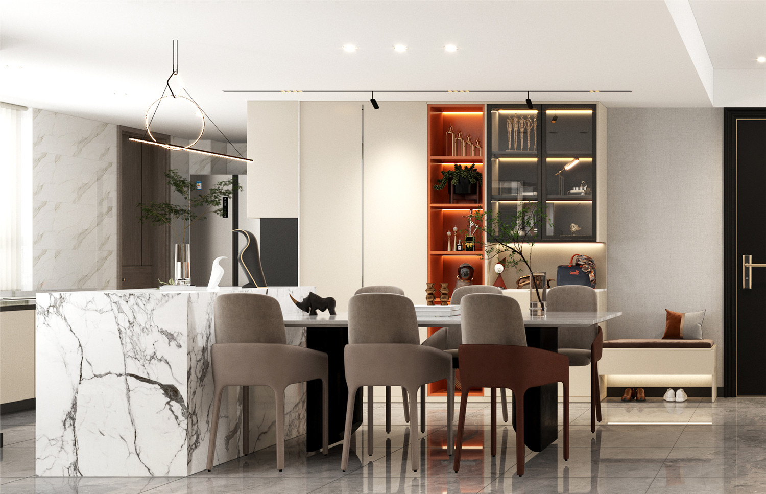 餐廳區域沿用了與客廳空間相同的配色與用材,不同的是設計感十足的吊燈與清新感十足的花鳥掛畫,讓就餐區域多了一抹溫馨靚麗氣息。