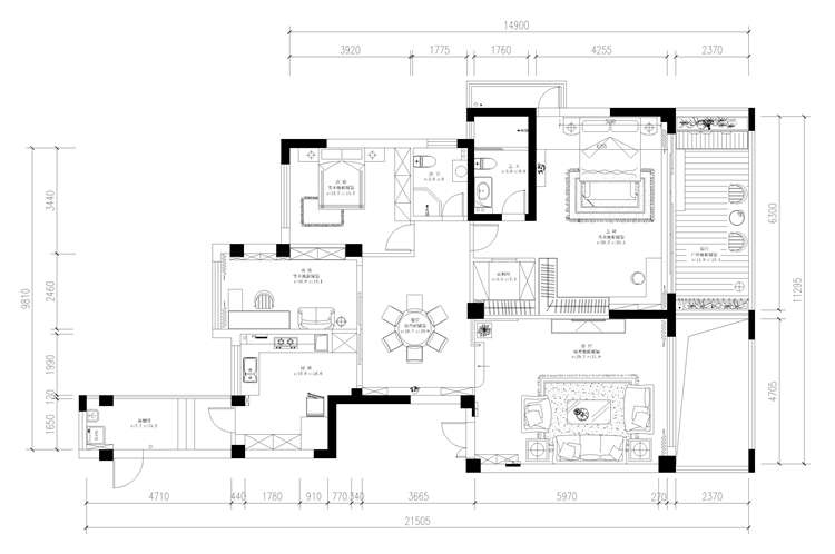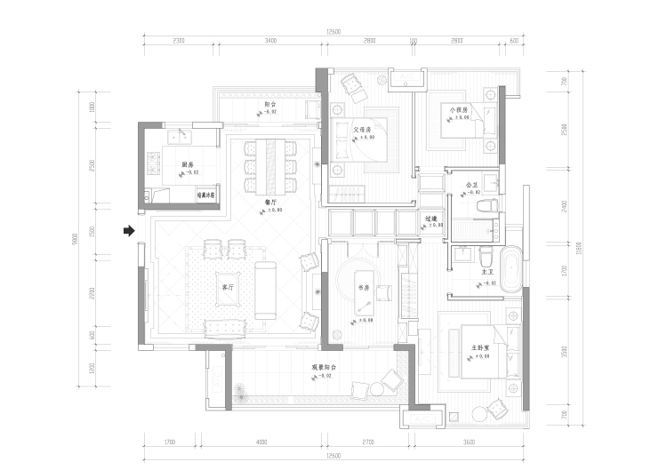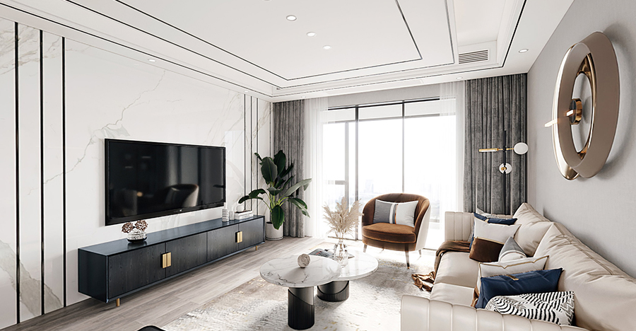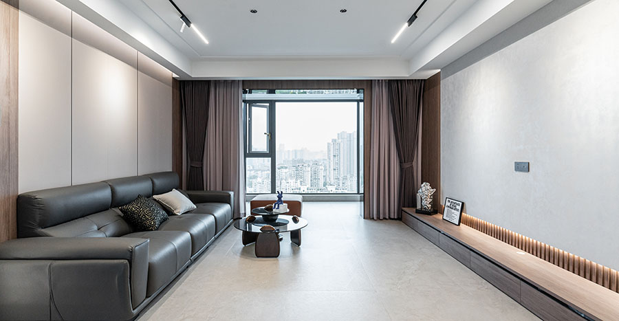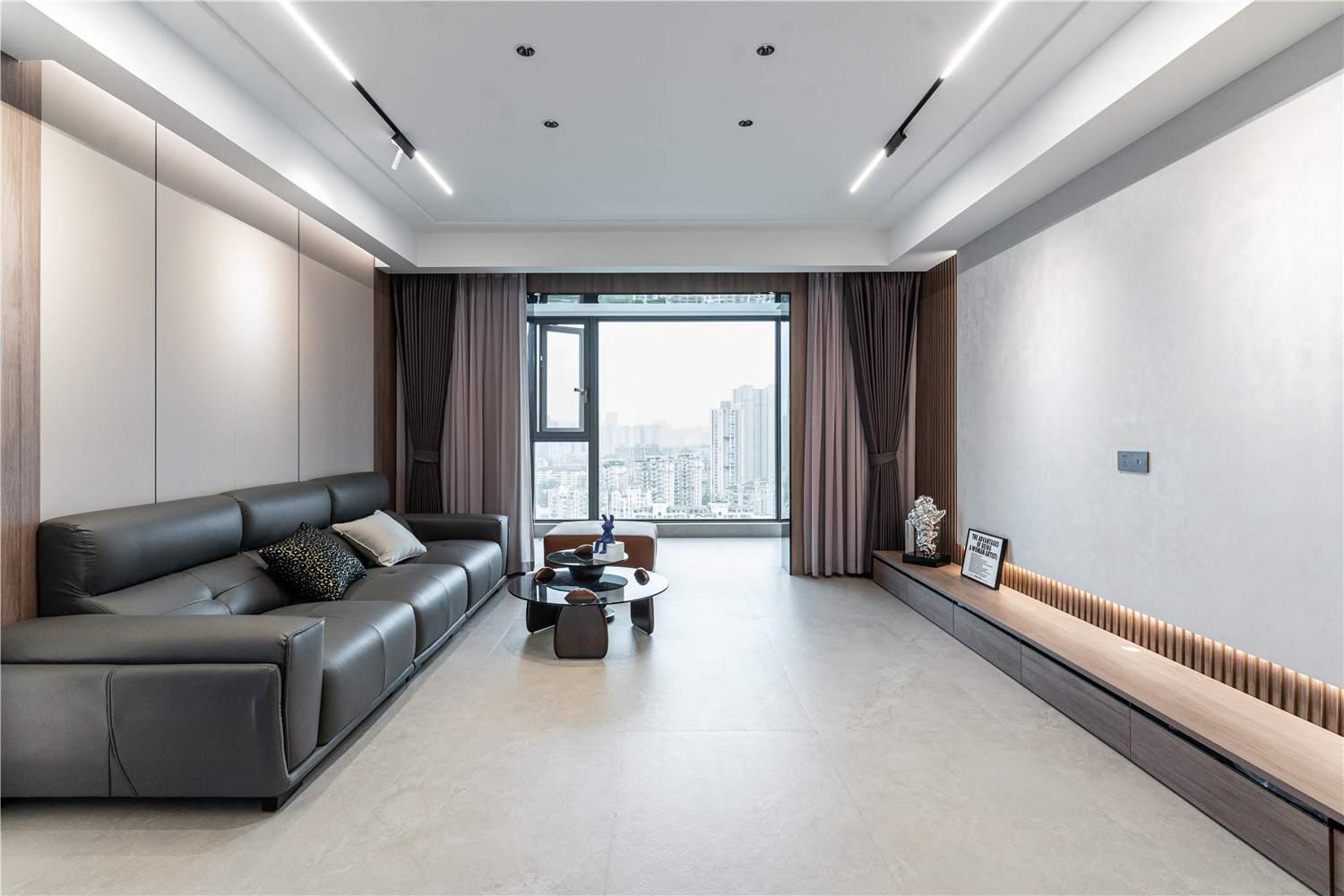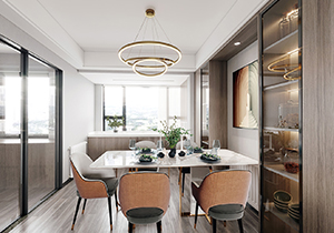 這是橡樹灣中一套160㎡的四居室,戶型面積中等,采光條件好,但內(nèi)部分區(qū)較多,休憩區(qū)分區(qū)雜亂,需要設計出有邏輯的行動走線,這樣整體空間才具有設計感和時尚感。將餐廳與客廳中的非承重墻拆除,將兩個功能區(qū)合二為一,擴大了公共區(qū)域面積,使日常走動更為方便,以過道為中心,南北各分布兩個休憩區(qū),日常生活變得更為舒適。