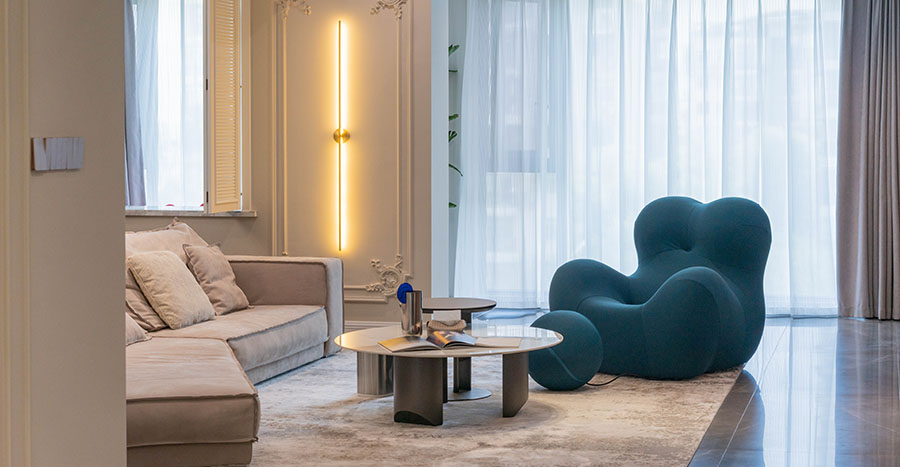 客廳以咖色系為主基調,浪漫的配色帶有女王氣質,簡約的線條中不失輕奢韻味;背景墻一面設計為書柜,一面設計為辦公空間,別有一番風味;灰色絨質沙發與橘色單椅圍合式放置,空間更具設計感,雕塑、擺件、燈具等元素,都令客廳帶有復古的氣息。