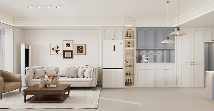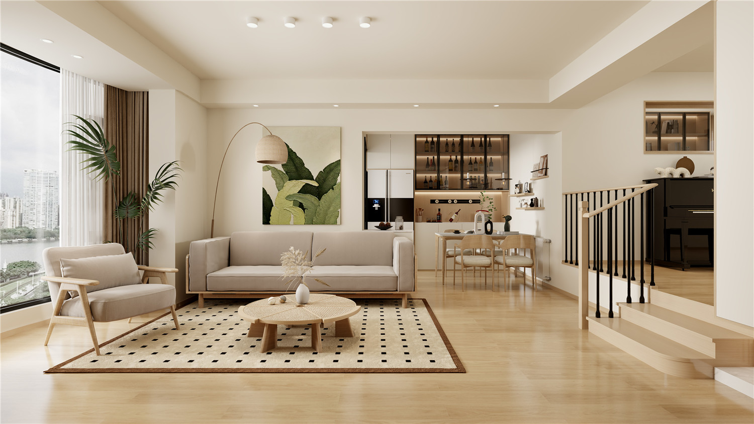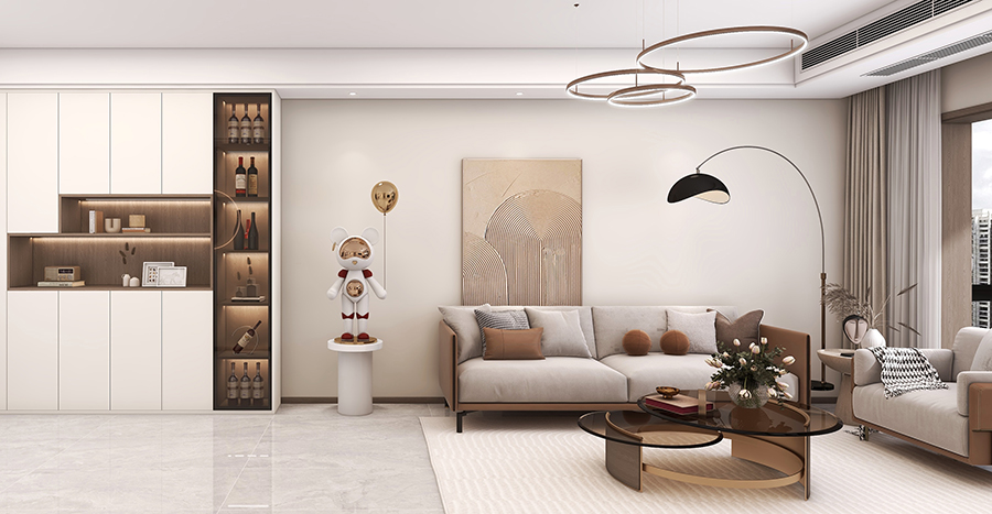 客廳整體用色素雅潔凈,強(qiáng)調(diào)柔和溫馨感。大面積的落地窗則確保陽光能夠更好的進(jìn)入會(huì)客區(qū)域,提升生活品質(zhì)。