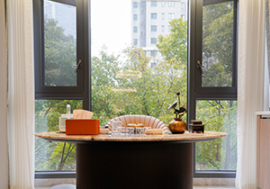 淺色系的主基調色搭配上藝術感十足的燈飾,簡約清新而又不失時尚氛圍。亮橘色的墻面裝飾,則打破了空間的單調感。