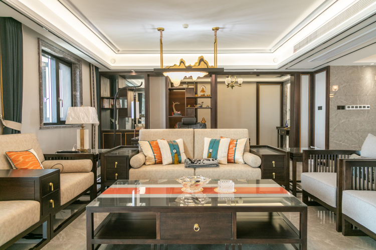 案例簡介:本案例的業主作為一個教師,對于傳統的中國文化有著濃厚的興趣,因此在與設計師交流的時候強烈的表達了自己對中式元素的喜愛。因此在本案例設計過程中,設計師為業主選用了經典的新中式風,同時借助各類質感元素的雜糅使用,演繹了一個復古而又不失摩登時尚氛圍的輕奢雅苑。簡約的線條、傳統的中式復古元素,讓家居空間呈現出豐富的層次與藝術的格調。
