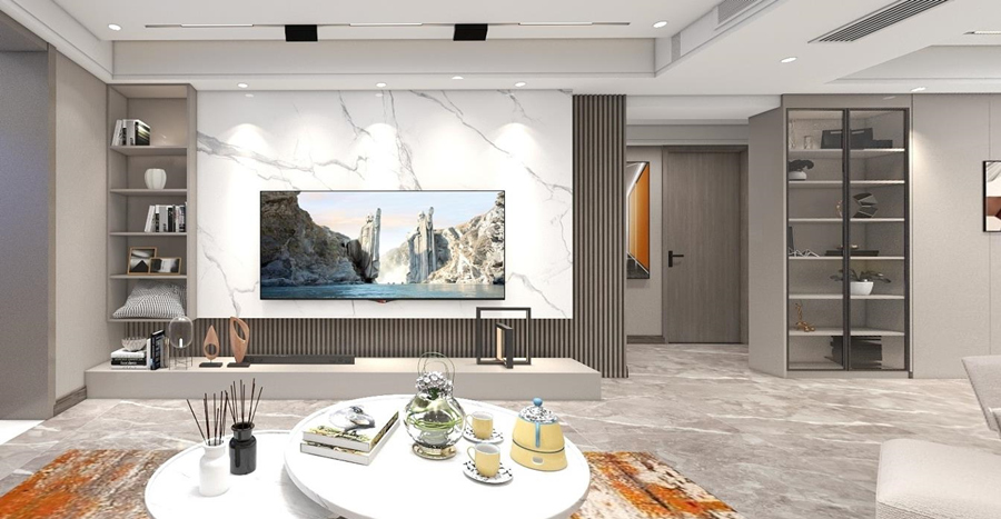 大面積的大理石瓷磚奠定了清冷通透的空間氛圍,搭配以質感溫潤的木材,有效提升了空間的視覺平衡感。