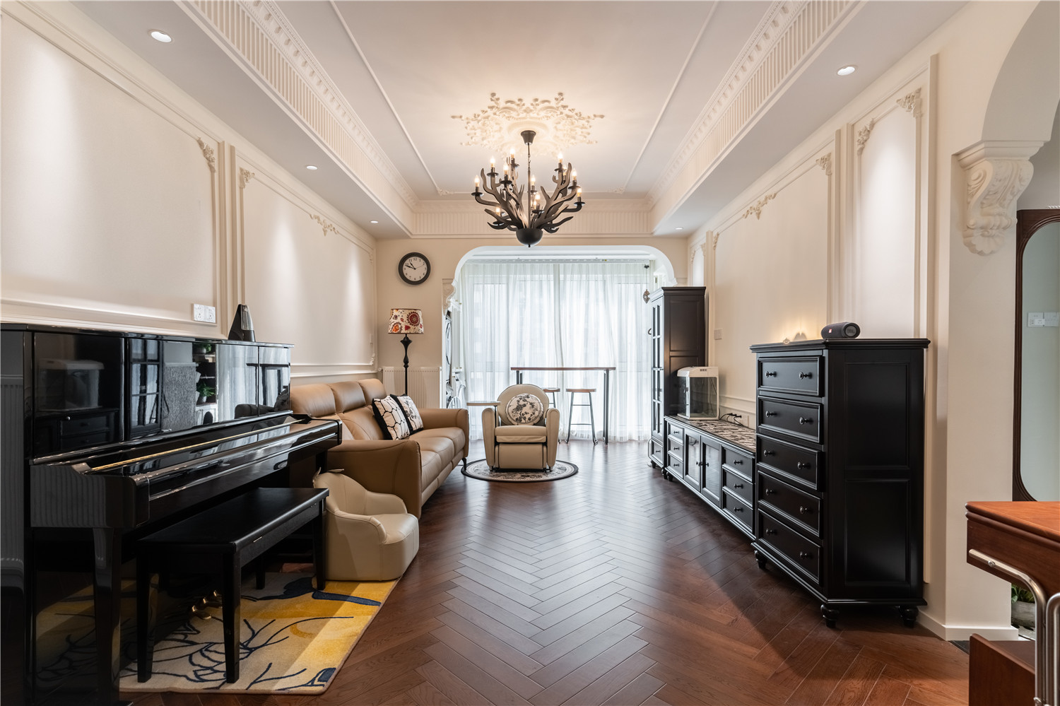 客廳區域借助莫蘭迪色系進行裝飾,強調一種朦朧的優雅氛圍。
