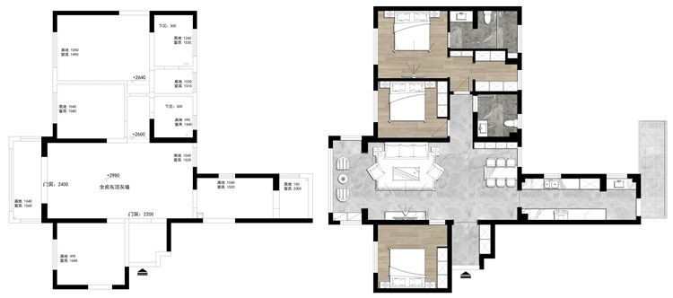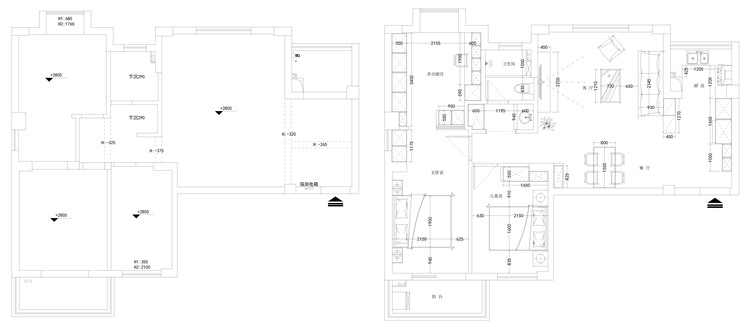這套位于泛海國(guó)際的四居室住宅建筑面積約為175㎡,戶(hù)型結(jié)構(gòu)雖然不算很規(guī)整,但是好在也沒(méi)有各種難以設(shè)計(jì)處理的犄角空間。為了將空間更加合理的利用,設(shè)計(jì)師將房屋中相對(duì)比較突兀的區(qū)域改造成廚房,這樣能夠借助戶(hù)型的結(jié)構(gòu)將廚房油煙更好的釋放出室外。同時(shí),為了提升主人的家居質(zhì)量,內(nèi)部?jī)蓚€(gè)小空間則直接融入主臥中改造成主臥附帶的衛(wèi)浴空間與迷你衣帽間。