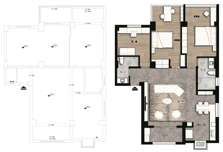 舒心苑這套三居室的住宅占地面積約為145㎡,整個(gè)戶(hù)型結(jié)構(gòu)相對(duì)比較規(guī)整,不過(guò)原有的戶(hù)型結(jié)構(gòu)并不能很好滿(mǎn)足業(yè)主的使用需求,因此設(shè)計(jì)師將主臥區(qū)域與外部陽(yáng)臺(tái)空間直接打通,將小陽(yáng)臺(tái)直接納入主臥,提升臥室區(qū)域的舒適感與采光度。為了滿(mǎn)足業(yè)主在家辦公及閱讀需求,設(shè)計(jì)師將其中一個(gè)次臥改造成小書(shū)房,同時(shí)將客衛(wèi)的面積向書(shū)房延伸,提升衛(wèi)浴空間的占地面積,以滿(mǎn)足正常使用需求。