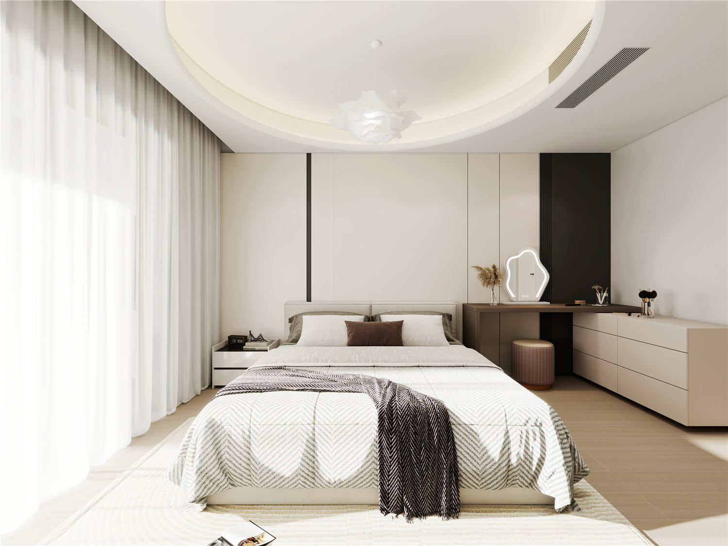 大面積落地窗有效提升臥室采光,藕粉色背景墻營(yíng)造溫馨靜謐感,搭配上色彩裝飾,簡(jiǎn)約而又時(shí)尚。