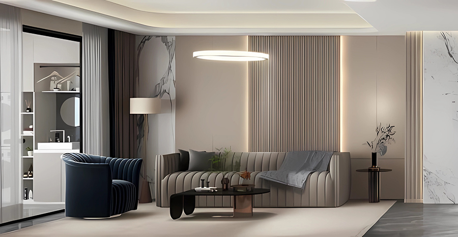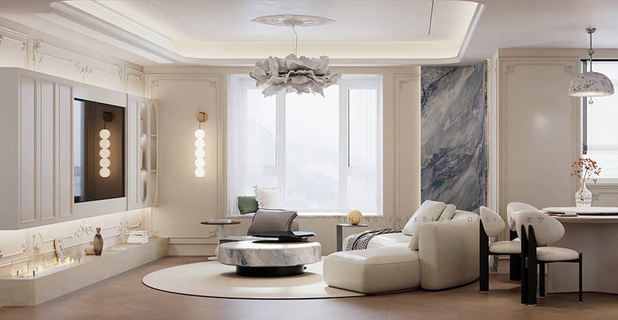 原本色搭配上白色強(qiáng)調(diào)空間簡(jiǎn)約整潔氛圍,曲線(xiàn)型沙發(fā)、圓形吊頂以及圓形地毯則通過(guò)線(xiàn)條的變化來(lái)提升空間的獨(dú)特藝術(shù)氛圍。