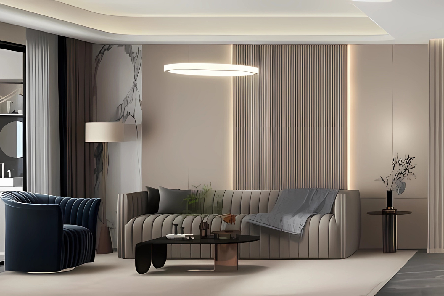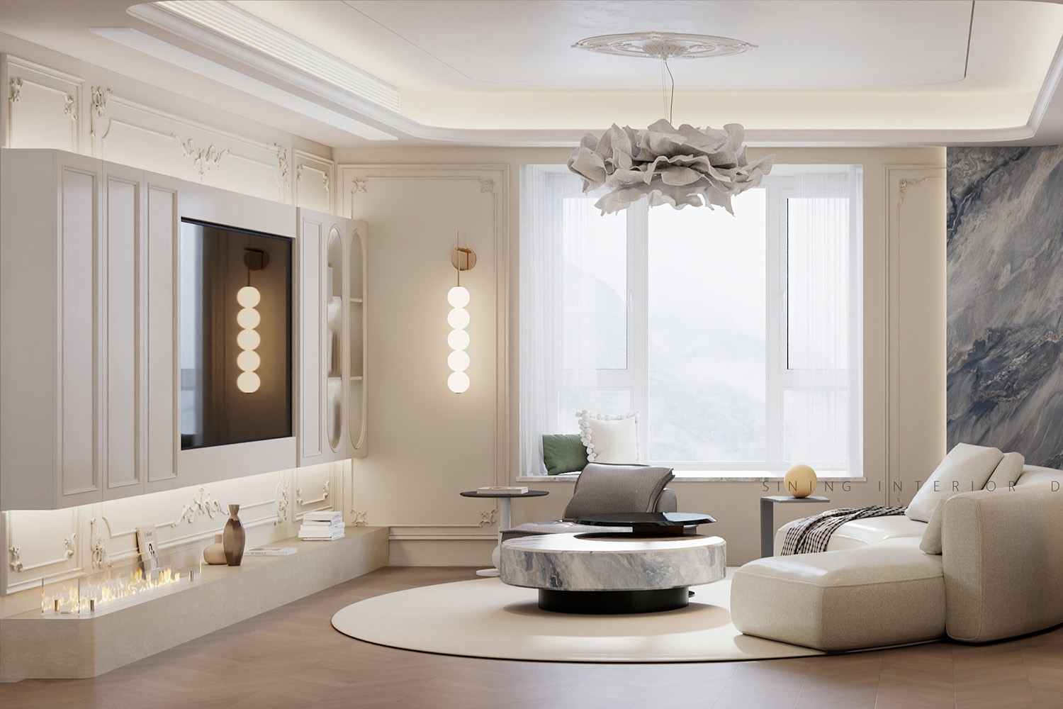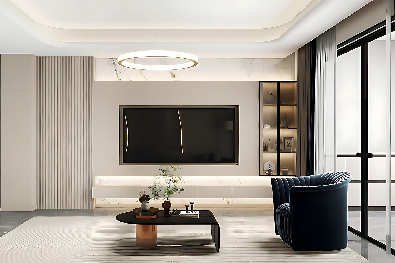 裸墻面搭配上結(jié)構(gòu)式處理簡(jiǎn)約而又不失個(gè)性摩登感,又曲線(xiàn)型打造的地板搭配上圓形茶幾,營(yíng)造超現(xiàn)代的獨(dú)特品味感。