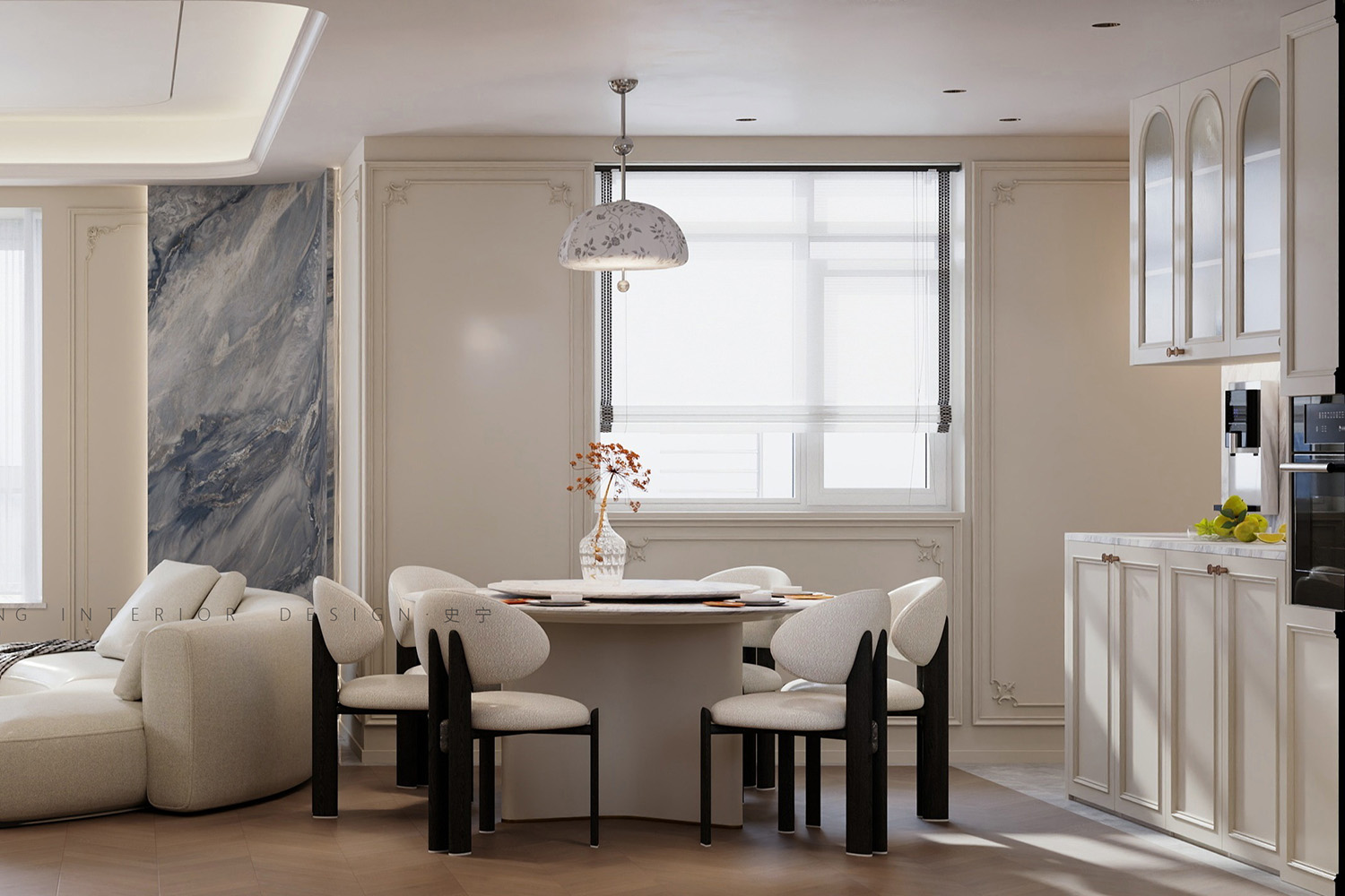 簡(jiǎn)約的灰色餐桌椅強(qiáng)調(diào)實(shí)用性,墻面處的壁畫(huà)則為就餐區(qū)域增添藝術(shù)時(shí)尚氛圍。