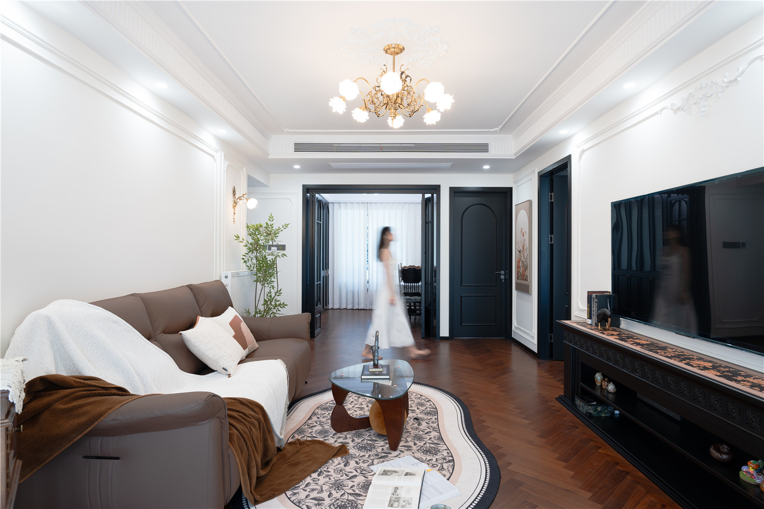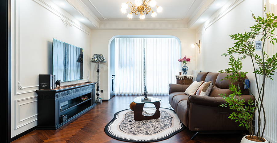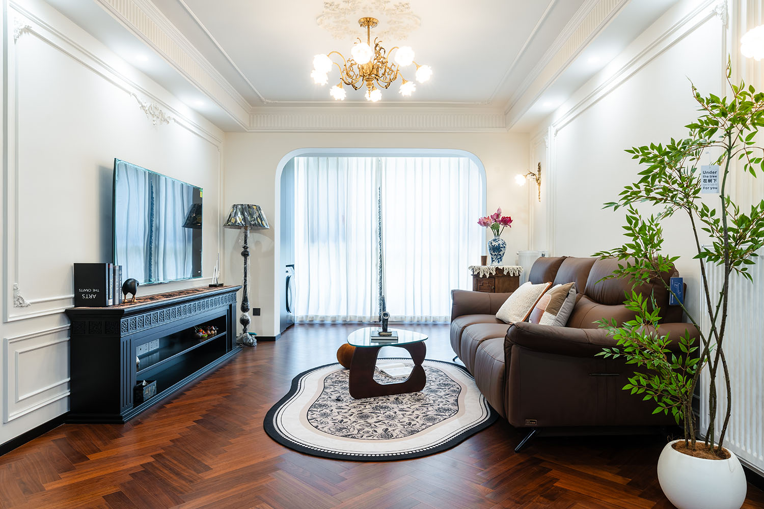 客廳區域使用了厚重感較強的深棕色電視柜,以強調中式風所特有的端莊大氣感。而白色系的沙發則讓空間的厚重感得到緩解,為空間增添了清新韻味。