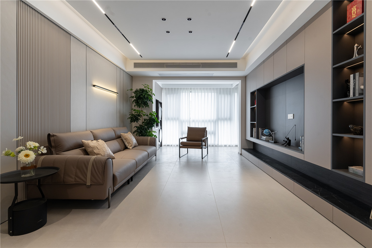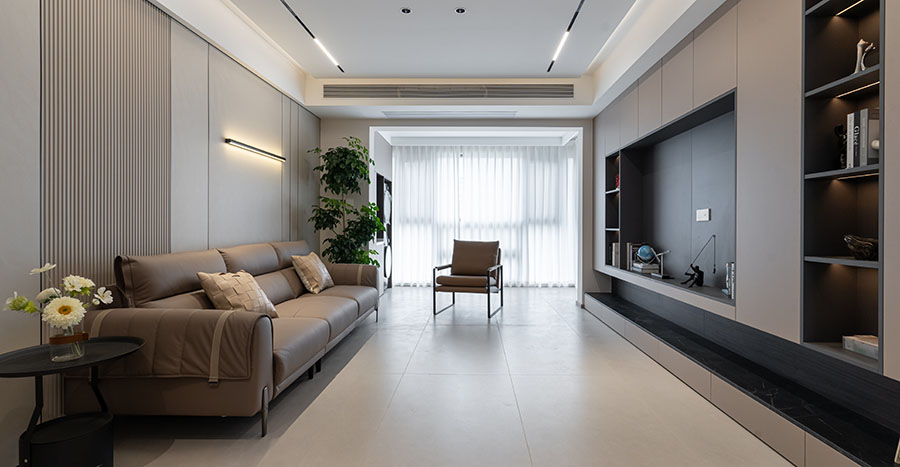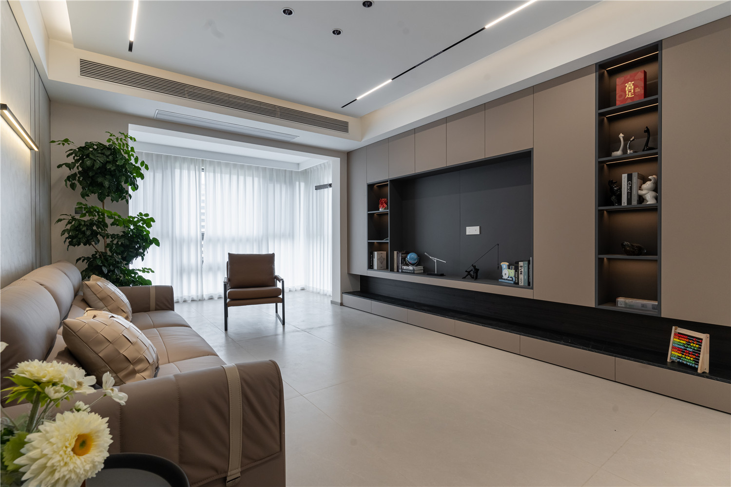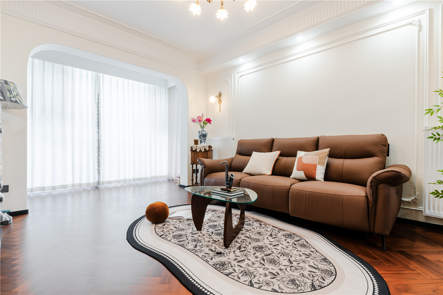 客廳區域使用了厚重感較強的深棕色電視柜,以強調中式風所特有的端莊大氣感。而白色系的沙發則讓空間的厚重感得到緩解,為空間增添了清新韻味。