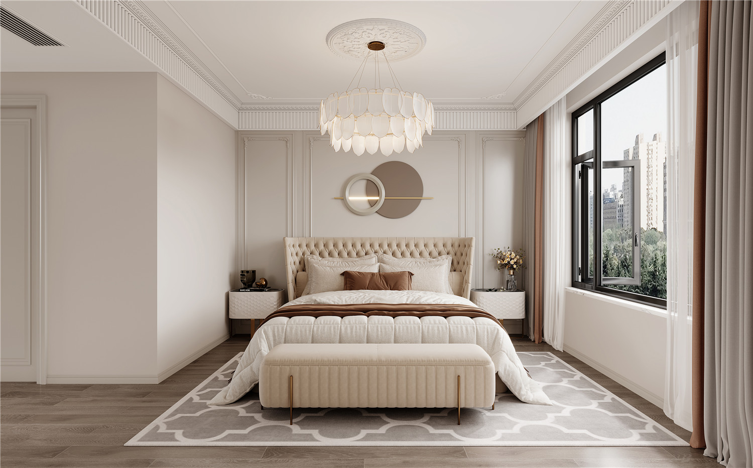 為了提升主臥區(qū)域的靜謐感,設(shè)計(jì)時(shí)使用了相對(duì)比較柔和的灰白配色,同時(shí)借助柔軟的地毯與溫潤(rùn)感十足的木質(zhì)地板來(lái)營(yíng)造休憩空間的溫馨柔和氛圍。