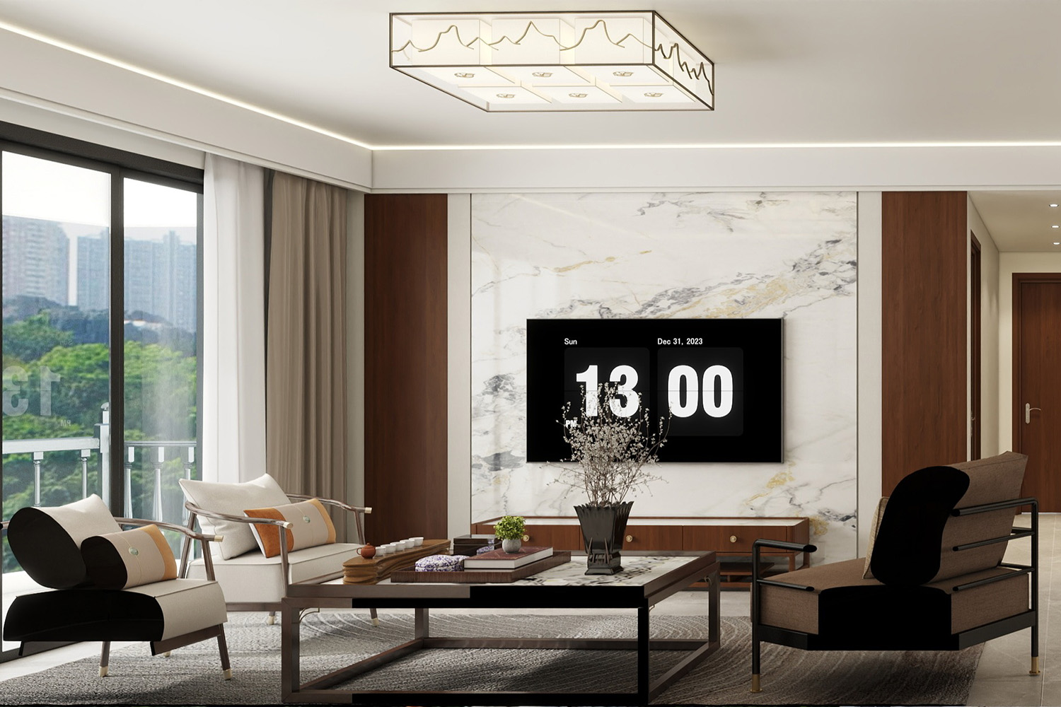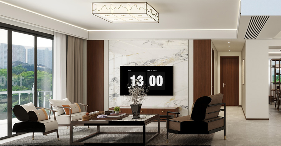 簡約木質仿古家具與現代時尚感濃烈的大理石背景墻之間的碰撞,呈現了宜古宜今的獨特時尚美。