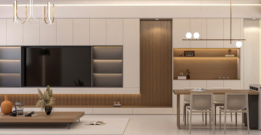 同馨花園這套140㎡的三居室雖然原有的戶型結構較為平整四方,且已經完成了基本的分區規劃,但是由于不能滿足業主日常起居使用需求,因此設計師根據業主個人使用需求將內部次臥區域直接打通,其中一部分向主臥延伸打造成衣帽間,而另外一部分則用于擴大另外一個次臥的面積,以提升生活品質感。廚房區域的墻面則直接打通,將廚房改造成為一個開放式設計,再借助軟隔斷融入就餐區域,提升空間的利用率。